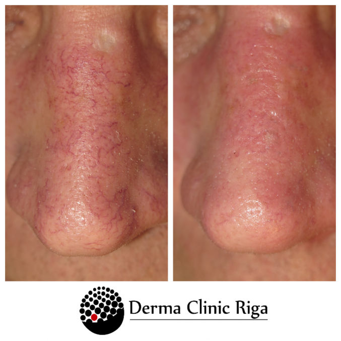 Dr. Evita JakušonokaPacientam tikai veikta diodes lāzera procedūra deguna asinsvadu likvidēšanai. Attēlos redzams pacients pirms procedūras un tūlīt pēc tās (tāpēc novērojams neliels apsārtums, kas mazinās jau pēc pāris stundām). Procedūra ir nedaudz sāpīga, nepatīkama.