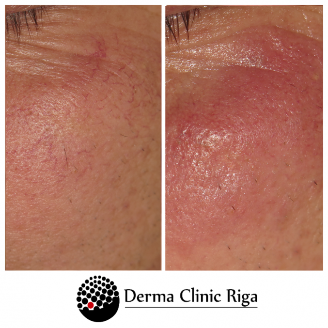 Dr. Evita JakušonokaPacientam tika veikta sejas paplašināto kapilāru likvidēšana izmantojot diodes lāzeru. Bildēs redzams pacients pirms procedūras un uzreiz pēc pirmās procedūras (tāpēc otrajā attēlā apstrādātā zona ir mazliet apsārtusi un sapampusi). Pirmo nedēļu pēc procedūras sejas āda var būt jutīga un apsārtusi. Ja ir nepieciešams, tad otru procedūru iespējams veikt pēc mēneša.