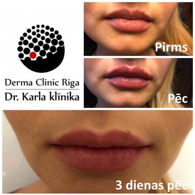 Dr. Evita JakušonokaAttēlā redzama kliente pirms un pēc lūpu apjoma palielināšana izmantojot filleru injekcijas. Procedūras rezultāts saglabājas apmēram gadu (tas atkarīgs no injicējamās vielas). Injekcijas aizliegts veikts, ja ir aktīvas vīrusu vai bakteriālās infekcijas.