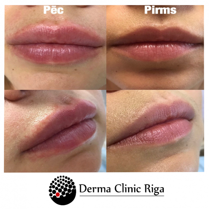 Dr. Evita JakušonokaAttēlos redzama kliente pirms un pēc lūpu apjoma palielināšana izmantojot filleru injekcijas (1 ml). Šīs procedūras rezultāts saglabājas apmēram gadu (noturība atkarīga no injicējamās vielas). Filleru injekcijas aizliegts veikts, ja ir aktīvas vīrusu vai bakteriālās infekcijas.