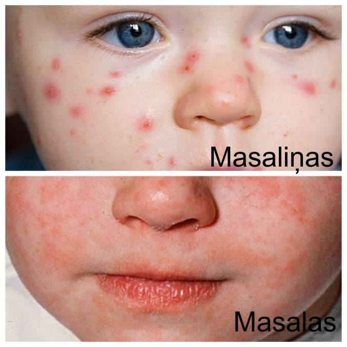 Masalas ir ļoti kontagioza infekcijas slimība, ko izraisa masalu vīruss. Raksturīgi sākotnējās pazīmes un simptomi ir drudzis (bieži vien 40ᵒC un augstāk), klepus, deguna tecēšana jeb rinīts, apsārtušas acis (konjunktivīts). 2 vai 3 dienas pēc simptomu sākšanās mutes gļotādā parādās mazi, balti, punktveida izsitumi – saukti par Koplika plankumiem. Savukārt, 3 - 5 dienas pēc simptomu parādīšanās, rodas sārti, plakani izsitumi, kas raksturīgi sākas uz sejas, pēc tam izplatās pa visu ķermeni. Izsitumiem ir tendence saplūst lielākos laukumos. Inkubācijas periods jeb laiks, kad sākas simptomi kopš kontakta ar inficētu personu, ir 10-14 dienas. Slimība ilgst 7-10 dienas. Transmisija notiek gaisa pilienu ceļā – klepojot, šķaudot, vīruss var izplatīties ar inficētās personas siekalām vai deguna izdalījumiem. Cilvēks parasti ar šo vīrusu slimo vienu reizi mūžā. Pie komplikācijām mināmi caureja, aklums, smadzeņu iekaisums jeb encefalīts, pneimonija. Masalu vakcīna ir efektīva, lai novērstu šo infekcijas slimību.