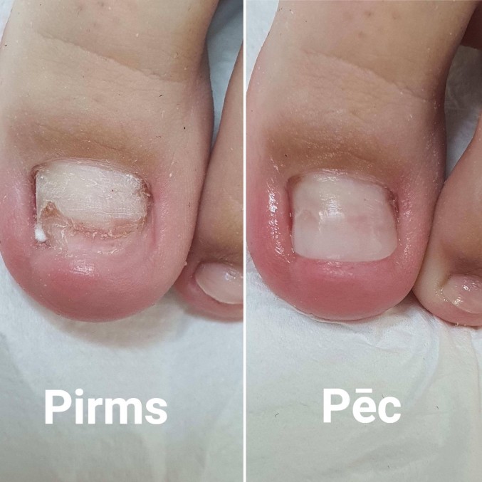 Attēlā redzami foto pirms un pēc procedūras pacientei sportistei, kas nagu zaudēja pēc piedalīšanās maratonā (liela slodze un nospiests īkšķa nags). Sākotnēji (gada laikā) mēģinājusi zaudēto nagu ārstēt (ataudzēt) pati, taču tas nav izdevies. Turklāt pēc traumas iegūta arī sēnītes infekcija, kuru ar dermataloga palīdzību izdevās izārstēt.