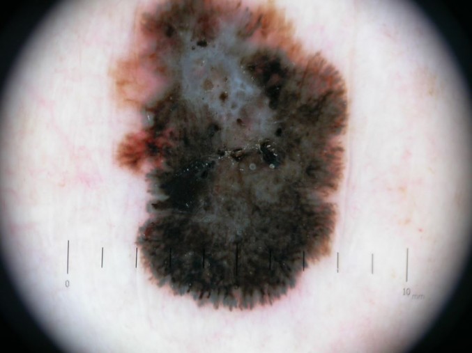 Сначала определяются ее признаки по схеме ABCDE с помощью дерматоскопии. Врач специальным аппаратом исследует кожные образования и констатирует те признаки, которые невозможно заметить невооруженным глазом. Также можно провести эксцизионную биопсию (хирургическое удаление всего образования) и определить сущность образования путем гистологического исследования.Уже дерматоскопически можно определить толщину меланомы.